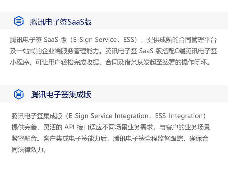 您可以在实名认证的前提下,与约定方完成线上签约,并将签约过程进行存证保全以确保签约公信力。我们为企业用户提供 SaaS 版和集成版两类接入方式,为个人用户提供小程序端及H5端的流畅体验。腾讯电子签致力于降低您的运营成本,提升多端签署效率。