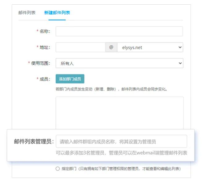 团队成员可以给每个邮件列表设置“邮件列表管理员”,管理员可以登录webmail管理邮件列表,包括新增、移除列表成员,修改邮件列表的配置属性。