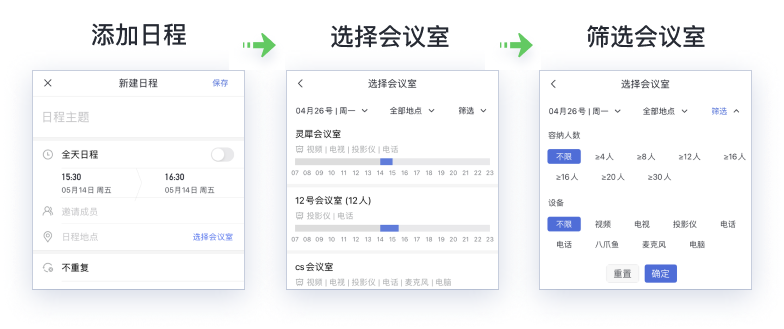 通知临时开会,空会议室却还没找到?新建日程时在日程地点输入框中“选择会议室”,空闲时间段1S抢订。