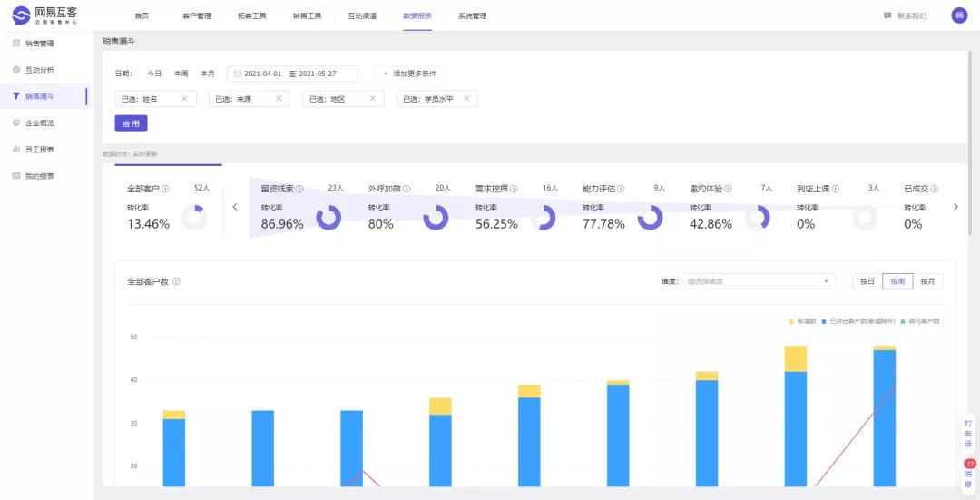 互客的销售分析,支持全量用户画像标签分析。如来源,年龄,性别,课程喜好程度,地区等社会学标签,需求画像等多维度分析,帮助找出最佳的学员画像,最佳的投放路径,最佳的转化方式。