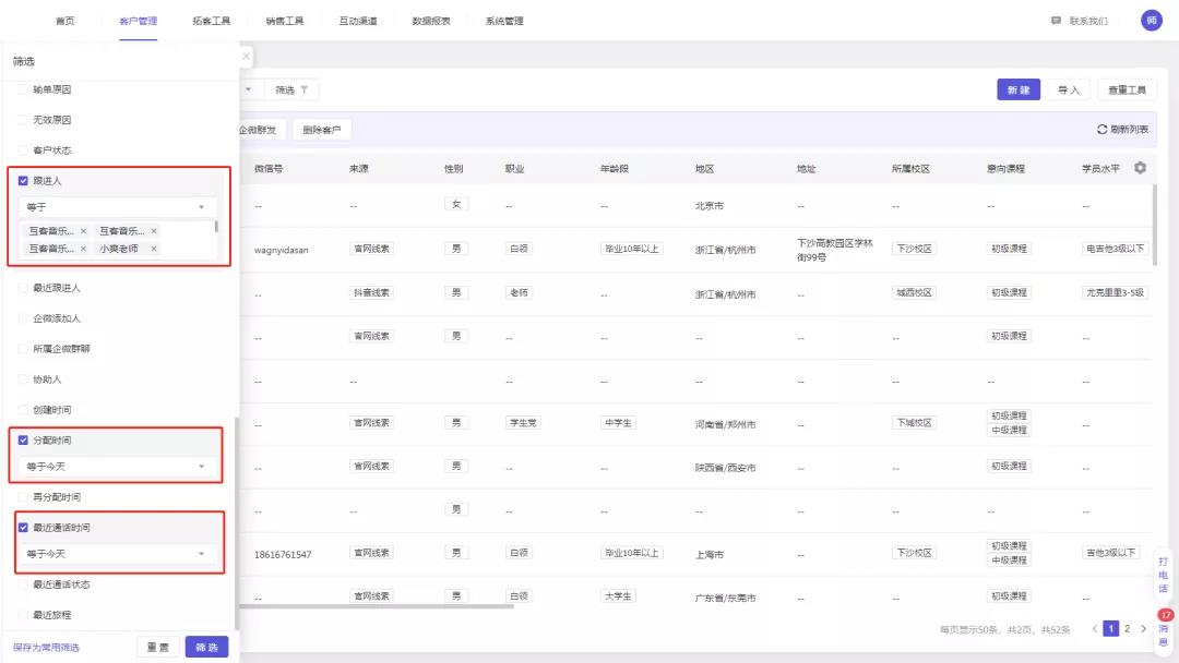 学员旅程可以细致的记录学员与顾问的互动点。配合强大的筛选项,能够多维度细致的筛选,满足多维度多场景多需要的学员筛选。如筛选今日分配并接通电话的学员。今日分配并接通电话且已加加企微的学员。细微的筛选,可以帮助管理者更有效判断销售对线索的利用程度。