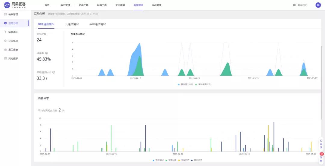 内容是让学员了解课程的重要的连接点,如何判断内容是否有效,学员最感兴趣的内容是什么,是机构内容生产者必须要了解的事情。互客的内容互动分析,通过记录每一篇内容的阅读情况,分享次数等。找到学员最感兴趣的课程,最感兴趣的内容,尽而提高学员的转化率。