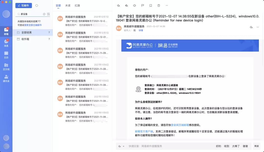 使用灵犀办公客户端能够获取到更多的设备信息,更加准确地监测IP异地登录,及时进行安全提醒,保障企业信息安全。用户可以在客户端增加一个设备管理列表,若登录的设备在当前列表中,则判断为不进行提示;若未在列表中,则进行提示,同时,用户可以自主管理列表中的设备。