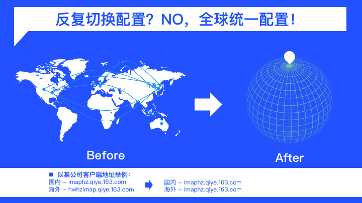因此,我们针对企业邮域名进行了全球智能解析改造,即海外用户可通过统一的客户端配置和Webmail地址高效使用网易企业邮箱。