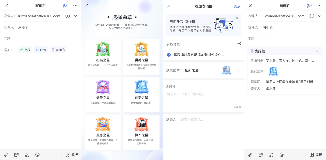 如此一举多得的表扬形式,只需在邮件中添加【表扬信】即可实现,选择一枚要颁发的勋章,然后添加表扬对象,设置颁奖词和颁奖人,最后完善邮件内容并点击发送,一封极具意义又充满趣味和仪式感的表扬信就完成了。