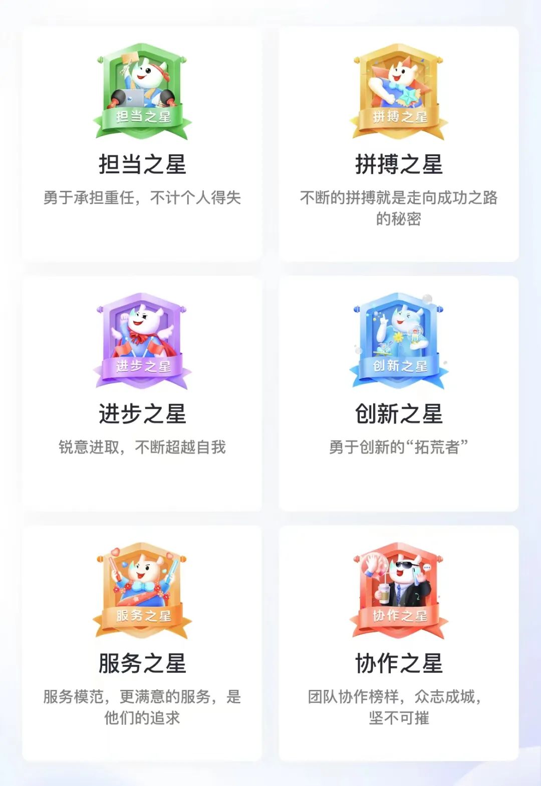 六枚勋章分别是担当之星、拼搏之星、进步之星、创新之星、服务之星、协作之星,对应责任、拼搏、进取、创新、服务、协作六种精神和能力,通过颁发勋章给予对应的认可。