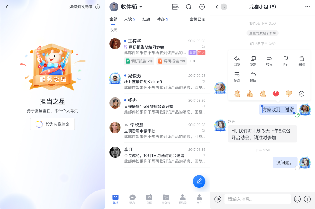 网易灵犀办公全新推出的表扬邮件功能,基于邮件办公的场景,通过智能多元、趣味轻松的形式,为企业及管理者提供一种全新的员工激励方式,从而帮助企业更好地打造团队氛围。