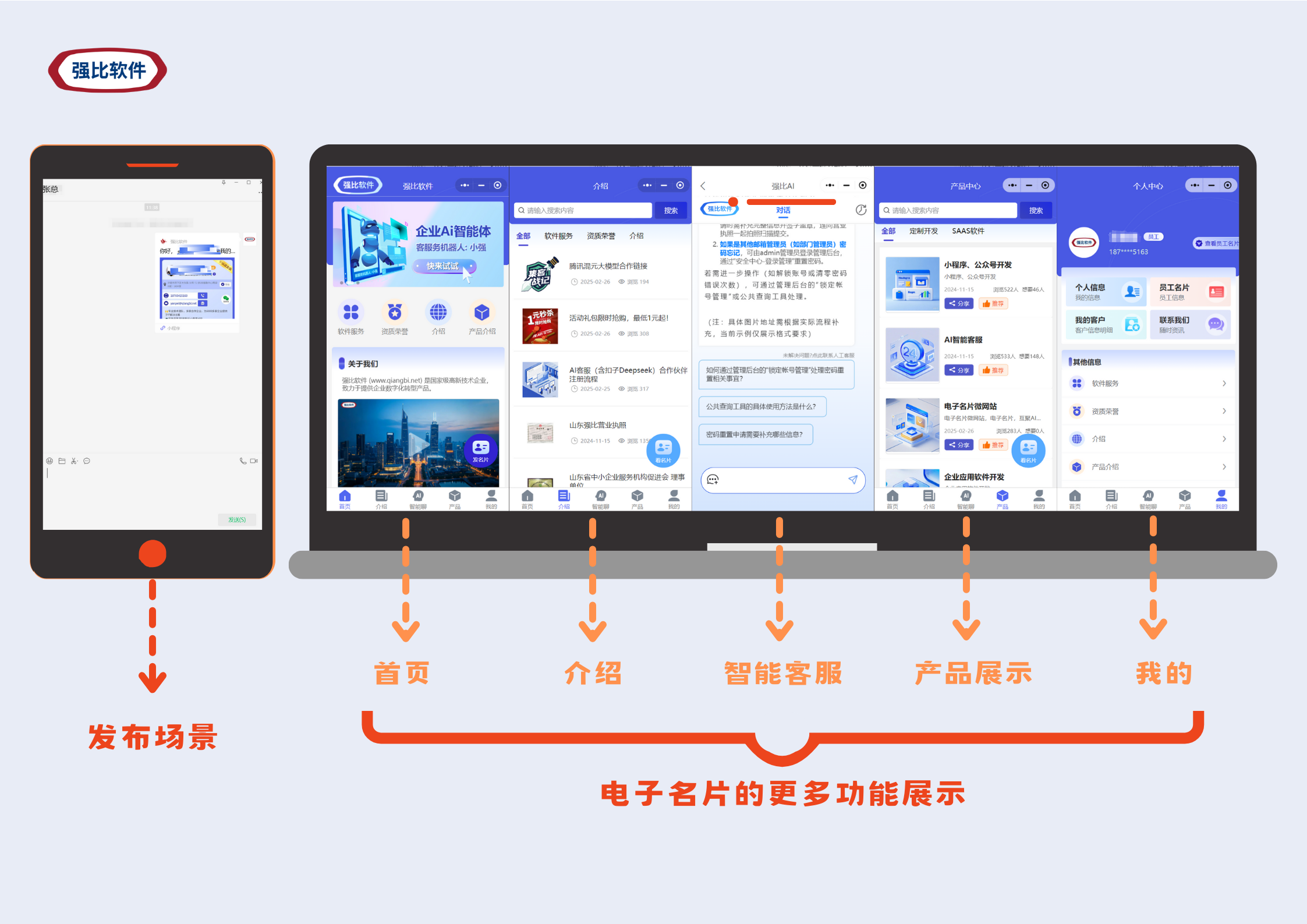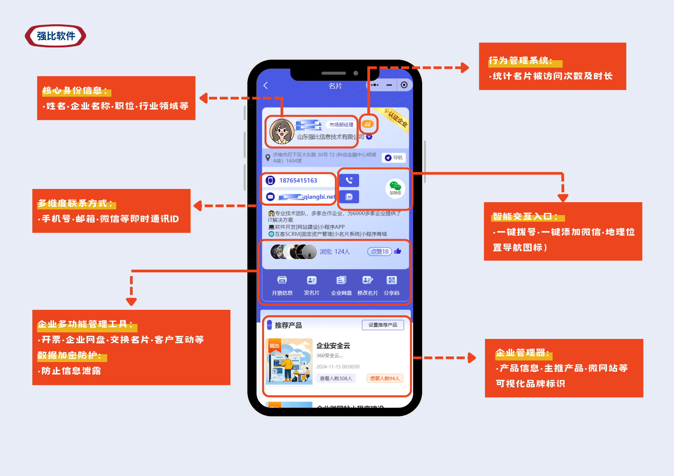 同时,电子名片/智能名片可实时分析访问流量,并与企业官网动态打通,清晰展示核心优势。强比软件支持个性化定制电子名片,满足多样化需求,是高效、专业的商务沟通工具,助力轻松提升品牌形象与客户互动效率。